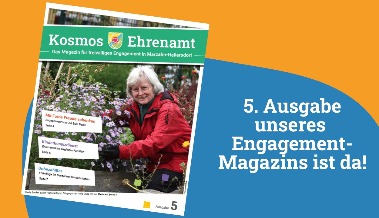 Pünktlich zu unserem 15-jährigen Jubiläum ist die zweite Ausgabe von „Kosmos Ehrenamt“, unserem Magazin für freiwilliges Engagement in Marzahn-Hellersdorf, erschienen! Es ist wieder ein farbenfrohes Magazin mit bewegten Geschichten entstanden, die das freiwillige Engagement in unse
