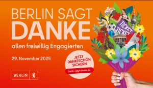 Der Aktionstag „Berlin sagt Danke“ am 29.11.2025 ist eine schöne Gelegenheit, sich für Ihr freiwilliges Engagement in Berlin feiern zu lassen. An diesem Tag danken der Berliner Senat, das Abgeordnetenhaus von Berlin und die Senatsverwaltung für Kultur und Gesellschaftlichen Zusammenh